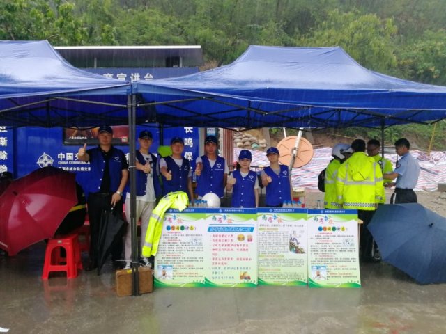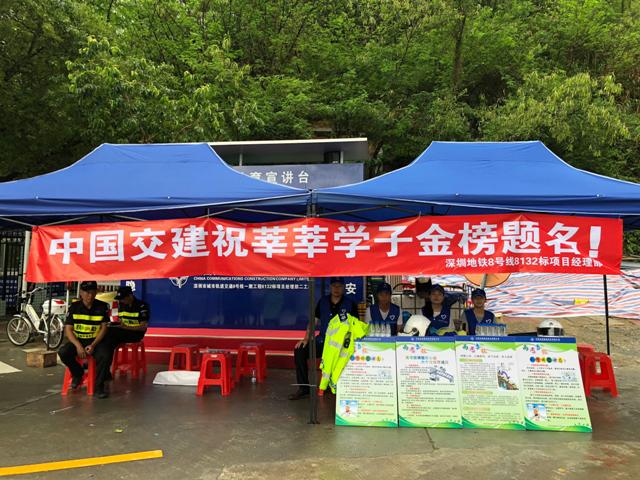 由于项目2-3工区紧邻深圳外国语学校考点,志愿者们在考点外设置了爱心助考服务站,为考生们准备了爱心雨衣及雨伞等物品应对突发降雨,同时免费向所有考生和家长们提供饮用水、遮雨棚等。并且专门为考生们制作了考前如何调整心态和考前减压的爱心宣传牌。