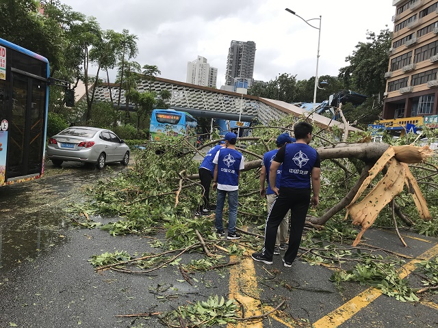 9月17日,强台风“山竹”已经过境。受台风影响,深圳市内大量树木倾倒,树叶及垃圾杂物堵集排水口,道路积水严重,车辆行驶深受影响。为尽快恢复道路畅通,公司深圳地铁8132标项目团支部组织各工区“蓝马甲”志愿者迅速对项目周边街道进行了抢救性清理工作。