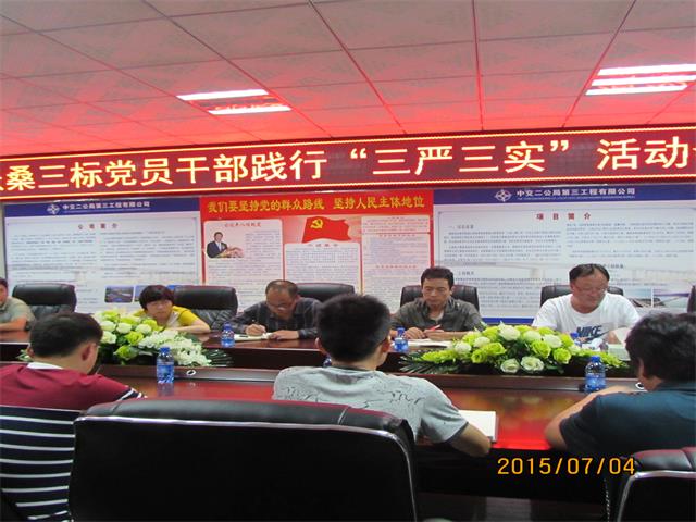 为继承党的优良传统,弘扬员工正能量。7月4日晚,张桑三标党支部组织党员干部和职工等30余人召开践行“三严三实”活动会。会上由党支部任书记对“三严三实”进行诠释,并要求党员干部要发扬先锋模范作用,将党的信仰,党的精神融入到工作中,生活中。随后,所有参会人员一起观看党员教育电视片——《信仰》。