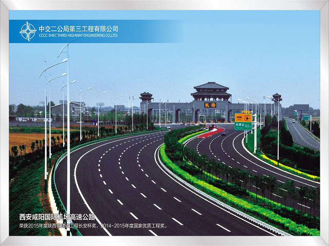 西安咸阳国际机场专用高速公路被誉为陕西省“省门第一路”,是交通运输部科技示范路,是国内第一条全线采用排水性路面的高速公路。三公司承建了20.58公里路面施工任务,2006年11月开工,2009年6月建成通车;施工中,在国内首次大面积采用了OGFC排水性路面、橡胶沥青碎石封层等路面施工新技术并获得成功,创造了中国企业新纪录。该工程先后获评2015年度陕西省建设工程“长安杯”和2014-2015年度国家优质工程奖。