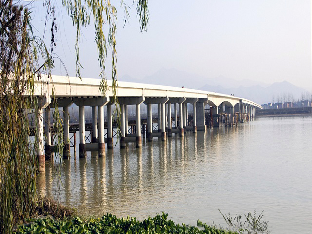 320国道富阳受降至场口段改建工程是富阳市实施无缝接轨大杭州,交通先行战略的奠基之作、龙头项目。三公司承担了路基工程第4标施工任务,主要工程为富春江特大桥。该桥横跨富春江,全长1543.04米,主桥上部为(68+120+68)米变截面预应力混凝土连续箱梁。该桥于2008 年 4月开工,2009 年 12月完工。该桥跨越江面宽度达800米,是公司承建的横跨水域宽度最大的桥梁。