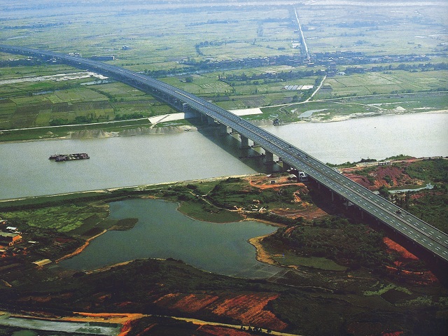 江西南昌绕城乐化至温家圳高速公路是江西省第一条全封闭、全立交、双向六车道高速公路,全长71.645公里。从2003年12月至20056年6月,三公司承建了三个标段,总长约12.975km的路基桥涵施工任务。赣江西支特大桥全长4368米,主桥形式为(70+110+110+70)米预应力混凝土变截面连续箱梁。该桥于2003年 12月开工, 2005 年 6月完工,是公司修建的第一座深水桥梁。