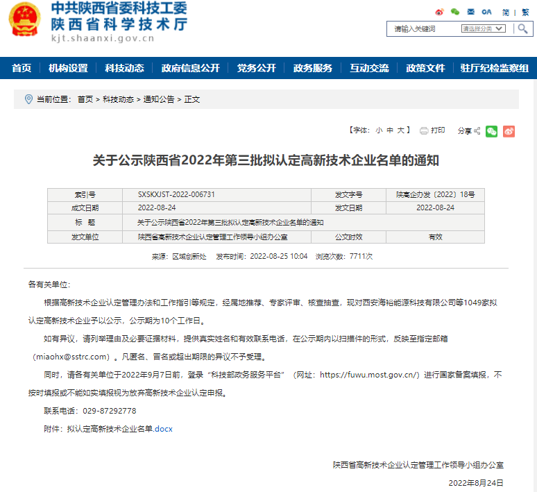 近日,根据高新技术企业认定管理办法和工作指引等规定,经属地推荐、专家评审、核查抽查环节,公司顺利通过陕西省2022年第三批高新技术企业复审认定。