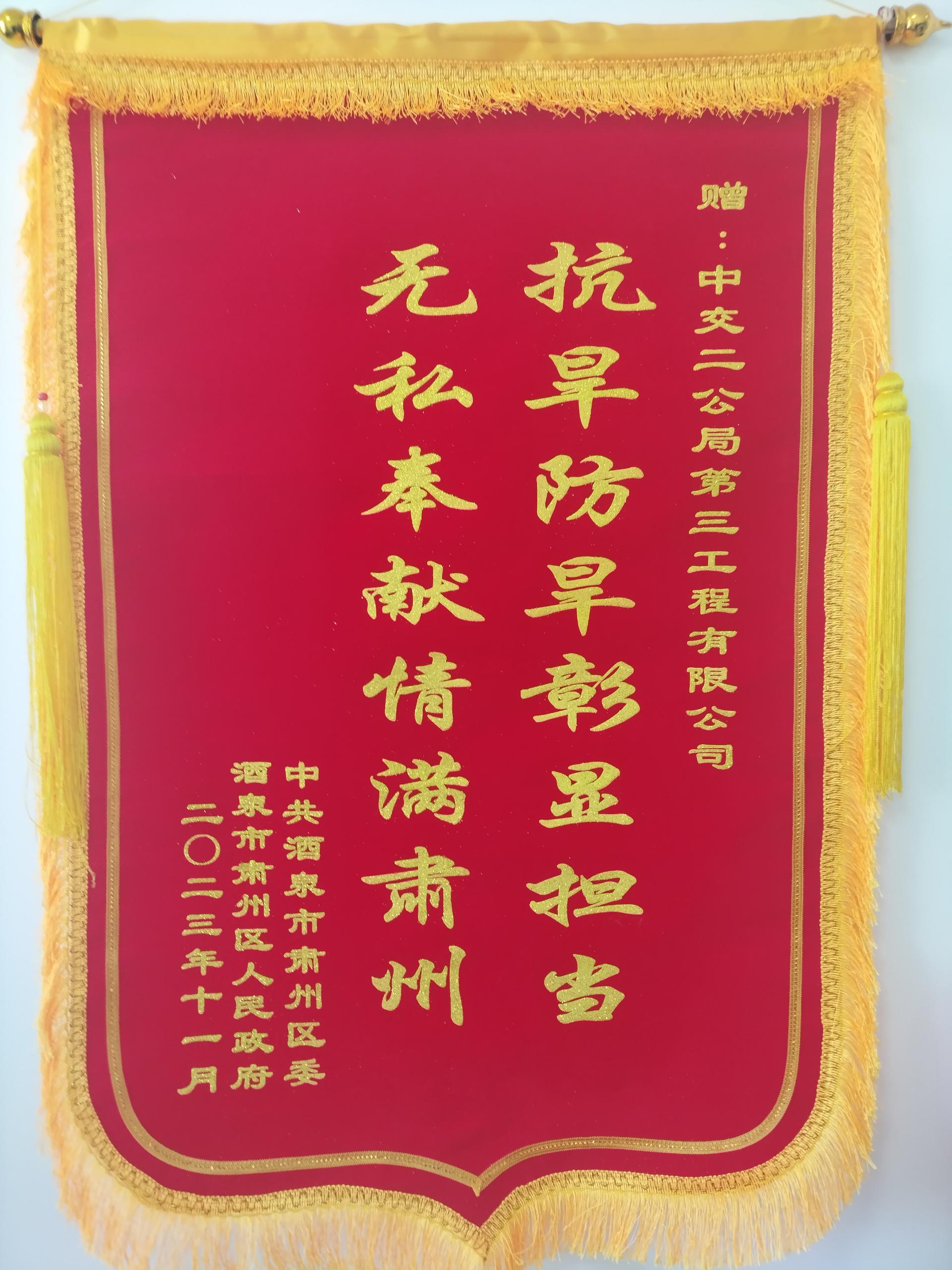 锦旗内容为“抗旱防旱彰显担当 无私奉献情满肃州”。感谢信指出,今年入夏以来,甘肃大部分地区遭遇旱情,尤其河西地区严重旱情多年罕见,人畜饮水陷入窘境,农业用水紧急告罄,经济损失巨大。面对日趋严重的旱情,灾情就是命令,抗旱行动刻不容缓,中交二公局三公司在中交集团、西北区域总部和二公局的统筹下,全力调配人力、物力紧急集中投入到抗旱工作之中,以最短的时间在甘肃酒泉市肃州区和金塔县打井16口,极大地缓解了旱情,用实际行动彰显了央企社会责任和担当,受到了灾区干部群众的一致好评,为打赢抗旱减灾攻坚战作出了突出贡献。
